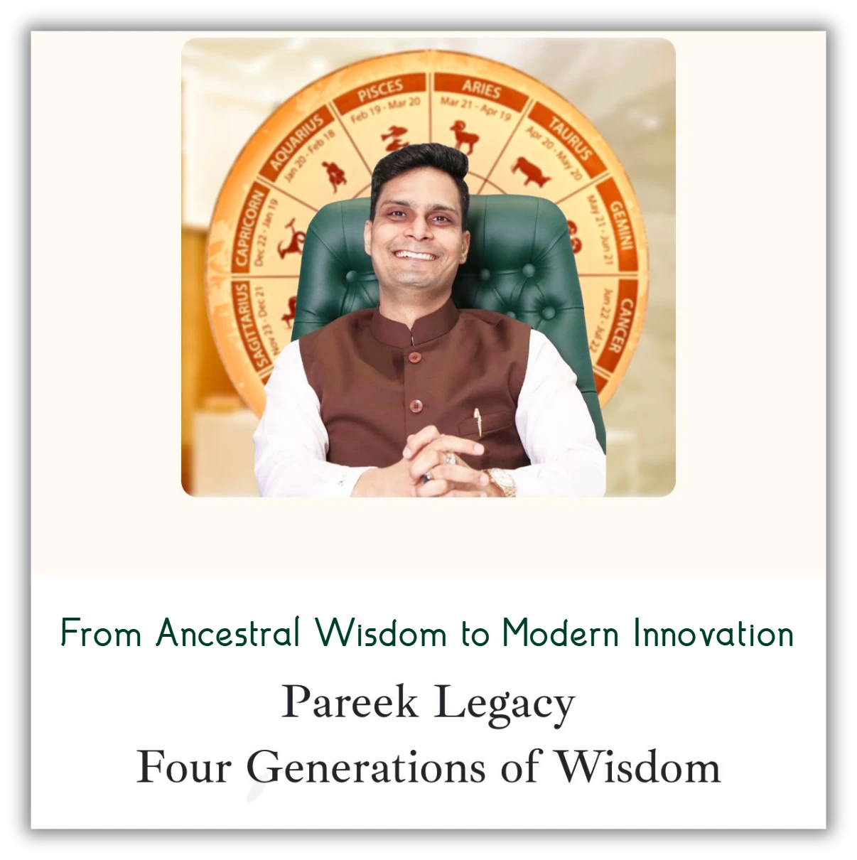 Aditya's lineage is a chronicle of enlightenment. His great-grandfather, Rajguru Balabaksh Pareek Ji, a blind yet profoundly insightful astrologer, laid the spiritual foundation. His grandfather, Rajguru Laxmi Narayan Pareek, a revered preacher and Vaastu savant, carried forth this legacy. Aditya's father, Dinesh Pareek, a true Brahmin, devoted his life to community service through temple rituals and profound astrological knowledge. Each generation has illuminated the Pareek legacy, blending wisdom, spirituality and service—a heritage Aditya proudly upholds.